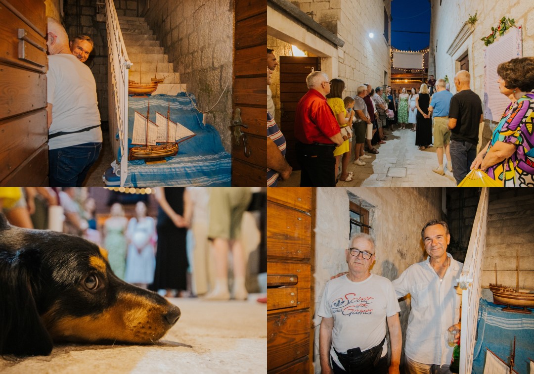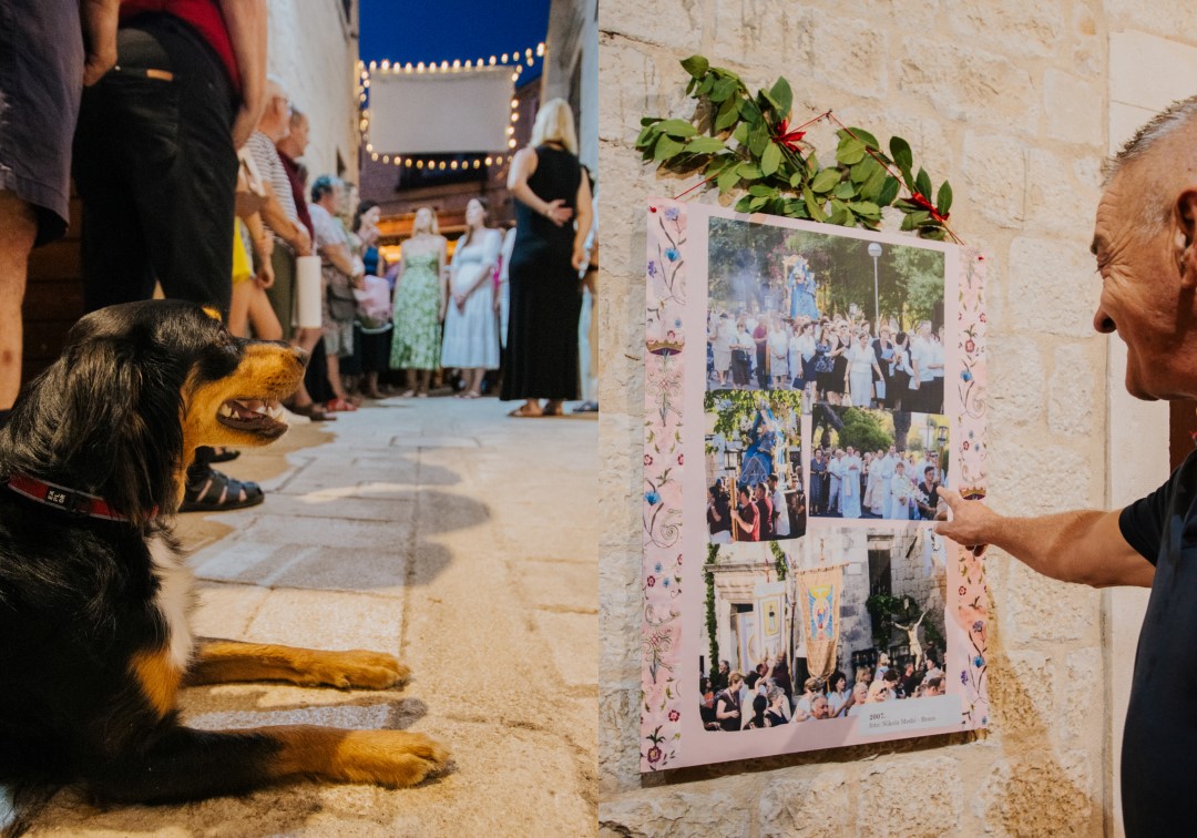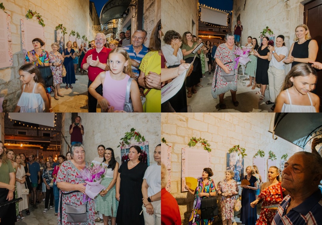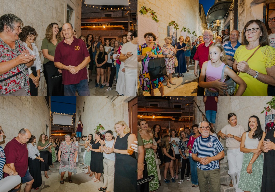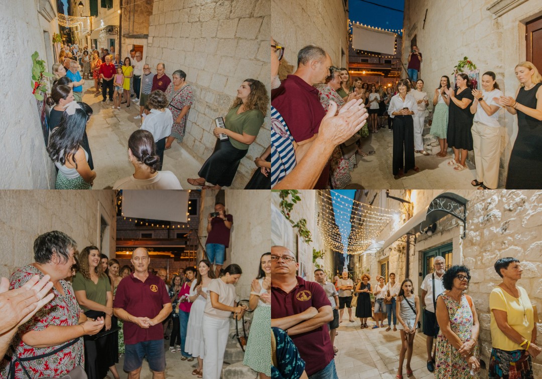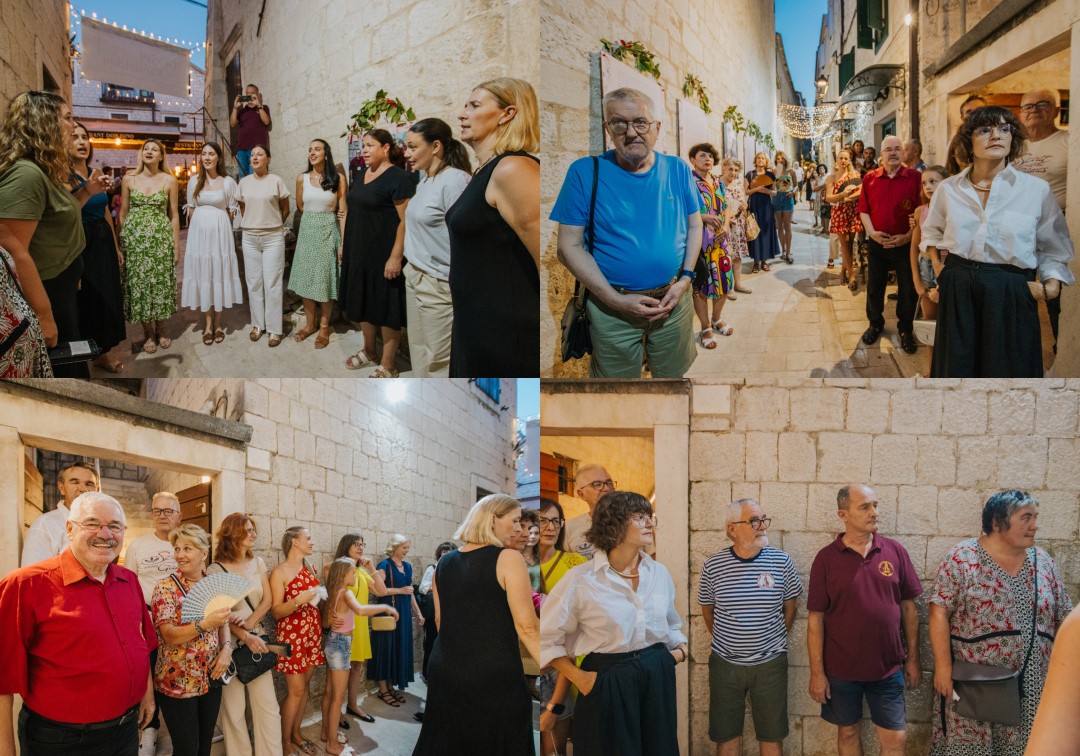 Posebno emotivan trenutak večeri bio je govor autorice izložbe Goranke Tomaš, više muzejske pedagoginje, koja je publiku, osim sa sadržajem, upoznala i sa simbolikom koja se krije u detaljima izložbe – poput ukrasa od javorovih listova na panoima – te zahvalila svima koji su sudjelovali u stvaranju ove prve ulične izložbe u Trogiru, izložbe u autentičnom ambijentu dalmatinske kale, u srcu živopisnih Pasika.