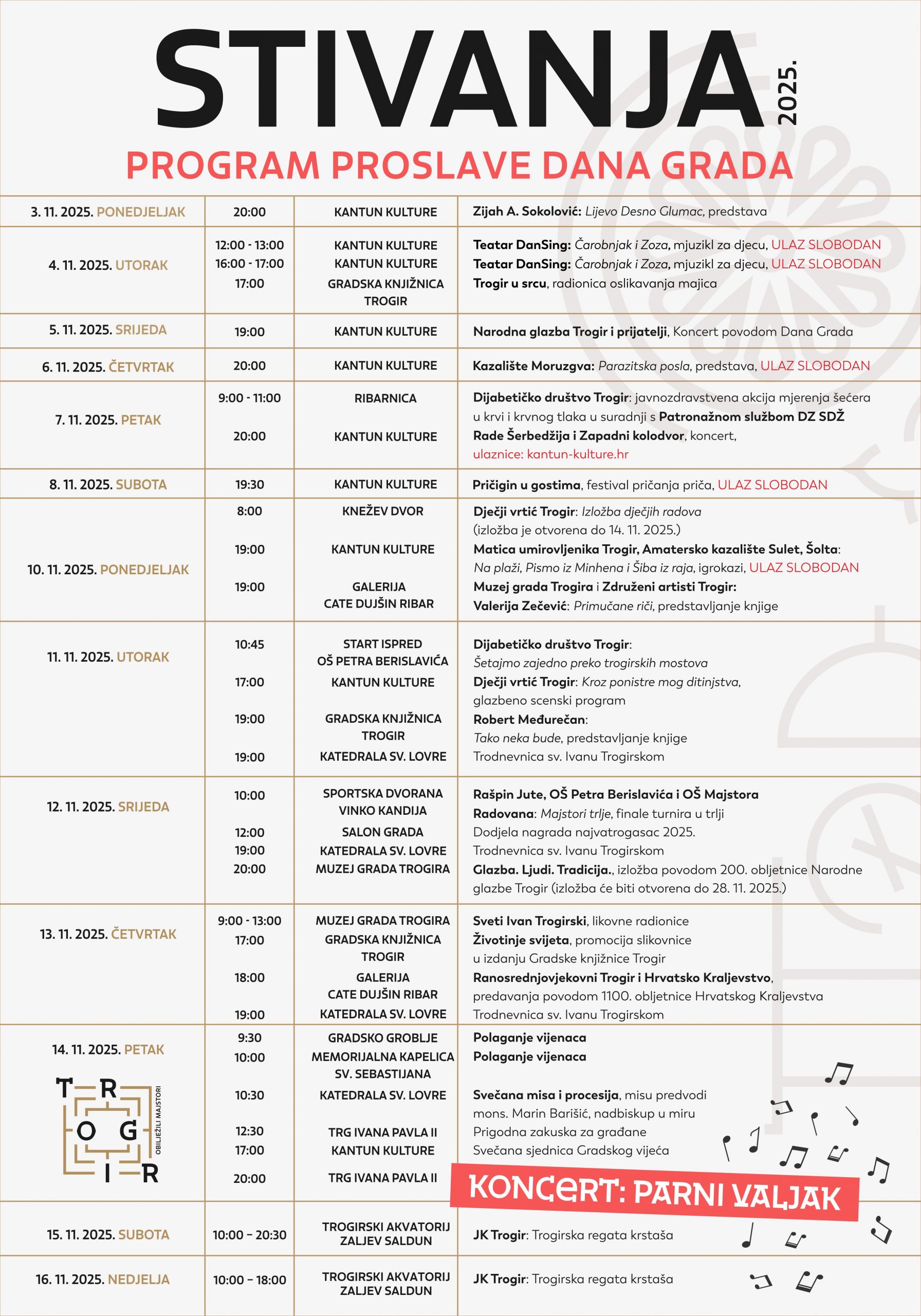 Obilje raznovrsnih događanja i ove će godine ispuniti Trogir povodom Stivanje – proslave blagdana sv. Ivana Trogirskoga i Dana grada Trogira! Od ponedjeljka, 3. do nedjelje, 16. studenog 2025. Trogirke, Trogirani i njihovi gosti moći će uživati u bogatom programu ispunjenom mnoštvom kulturno-umjetničkih, vjerskih, sportskih i društvenih događanja. U duhu zajedništva, stvaralaštva i tradicije, … Nastavi čitati Donosimo program Stivanje 2025.!