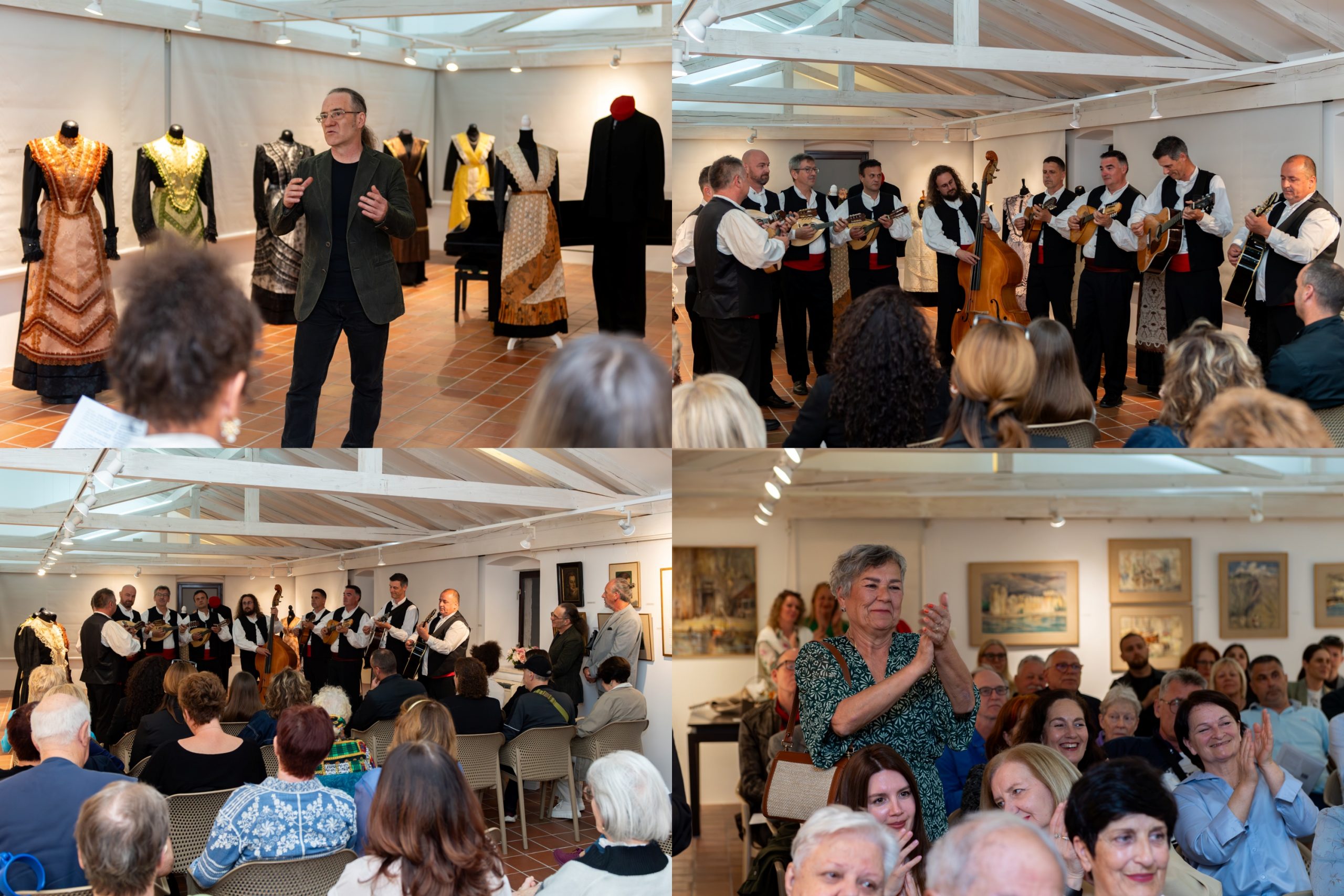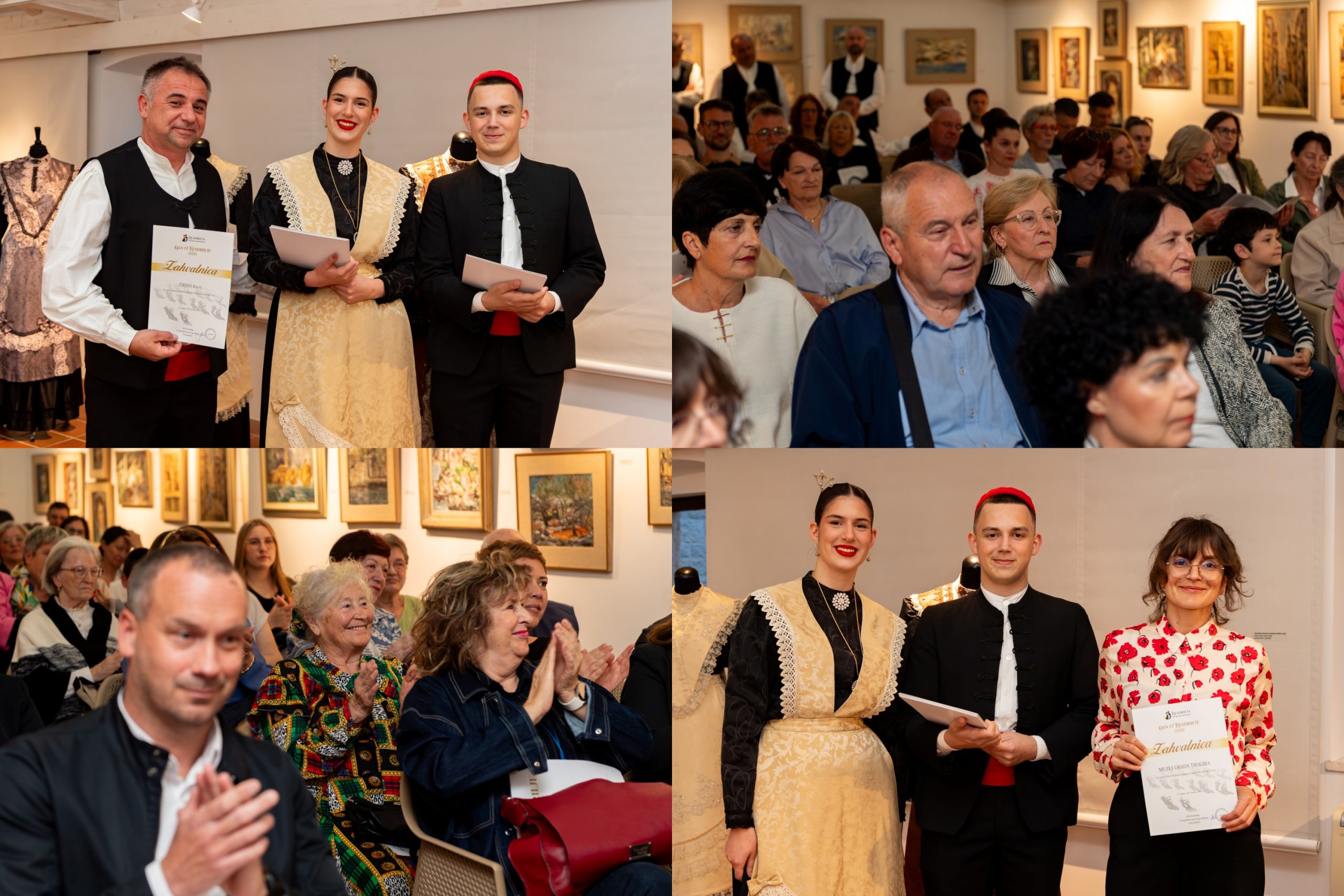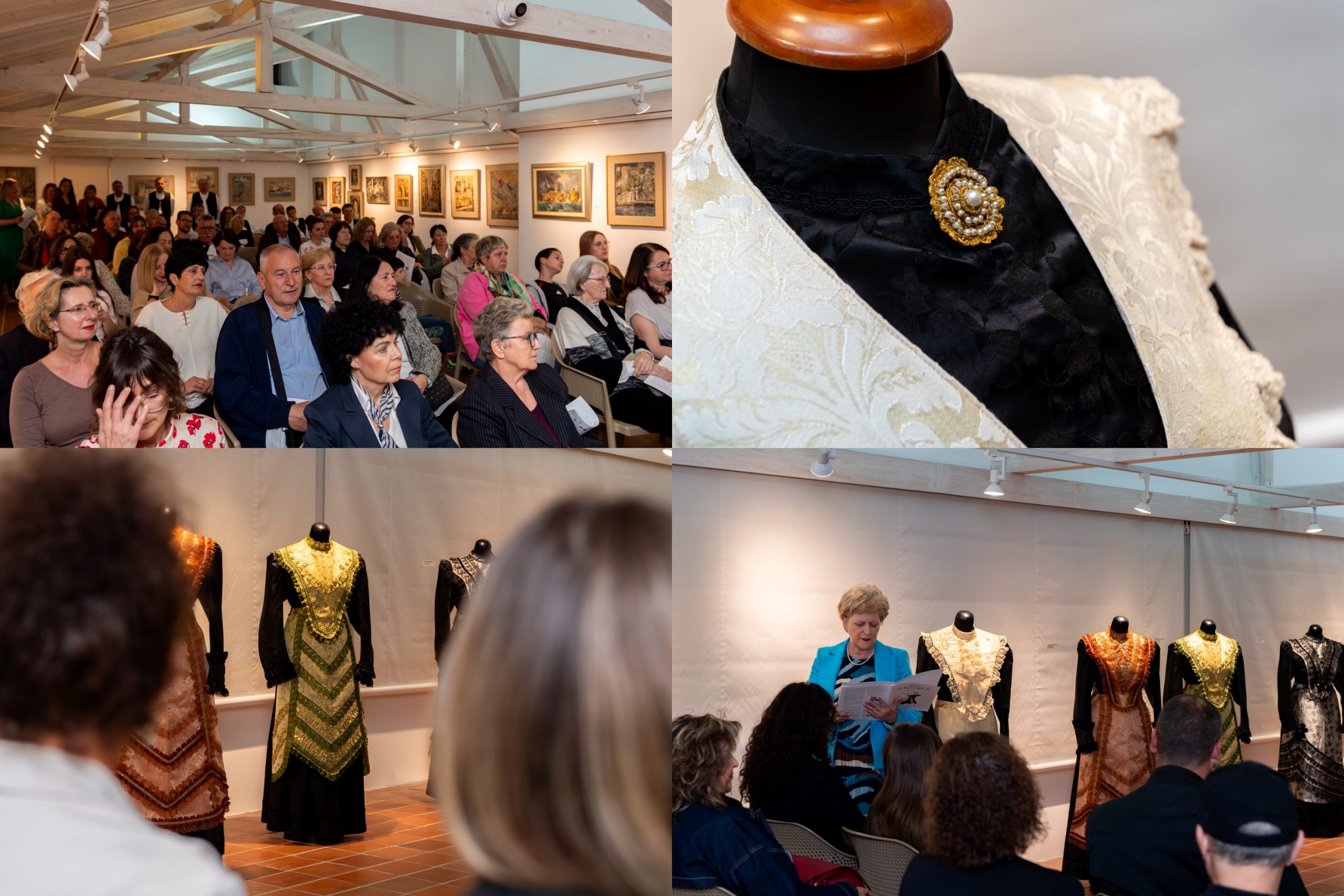 Nakon dodjele prigodnih zahvalnica donatorima i sponzorima, okupljenima su se obratili Jasna Popović, voditeljica Područne konzervatorske službe Trogir, te autori izložbe Anita i Mario Galić. Večer je potom dobila glazbeni ton – o nosaču zvuka „Folklorni plesovi srednje Dalmacije“, objavljenom u izdanju Extra Musica, govorili su Jakov Košćina i Ivan Cinotti, dok je mandolinski orkestar KUD-a „Kvadrilja“ publiku oduševio izvedbom Šotića. Čast da otvori izložbu pripala je Viktoru Novaku, zamjeniku gradonačelnika Grada Trogira. Program je vodila dr. sc. Danka Radić.