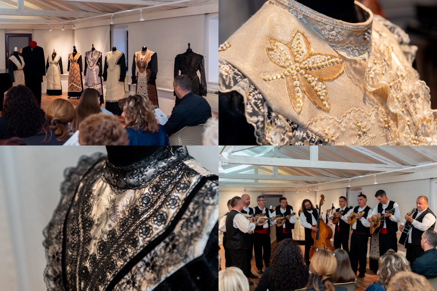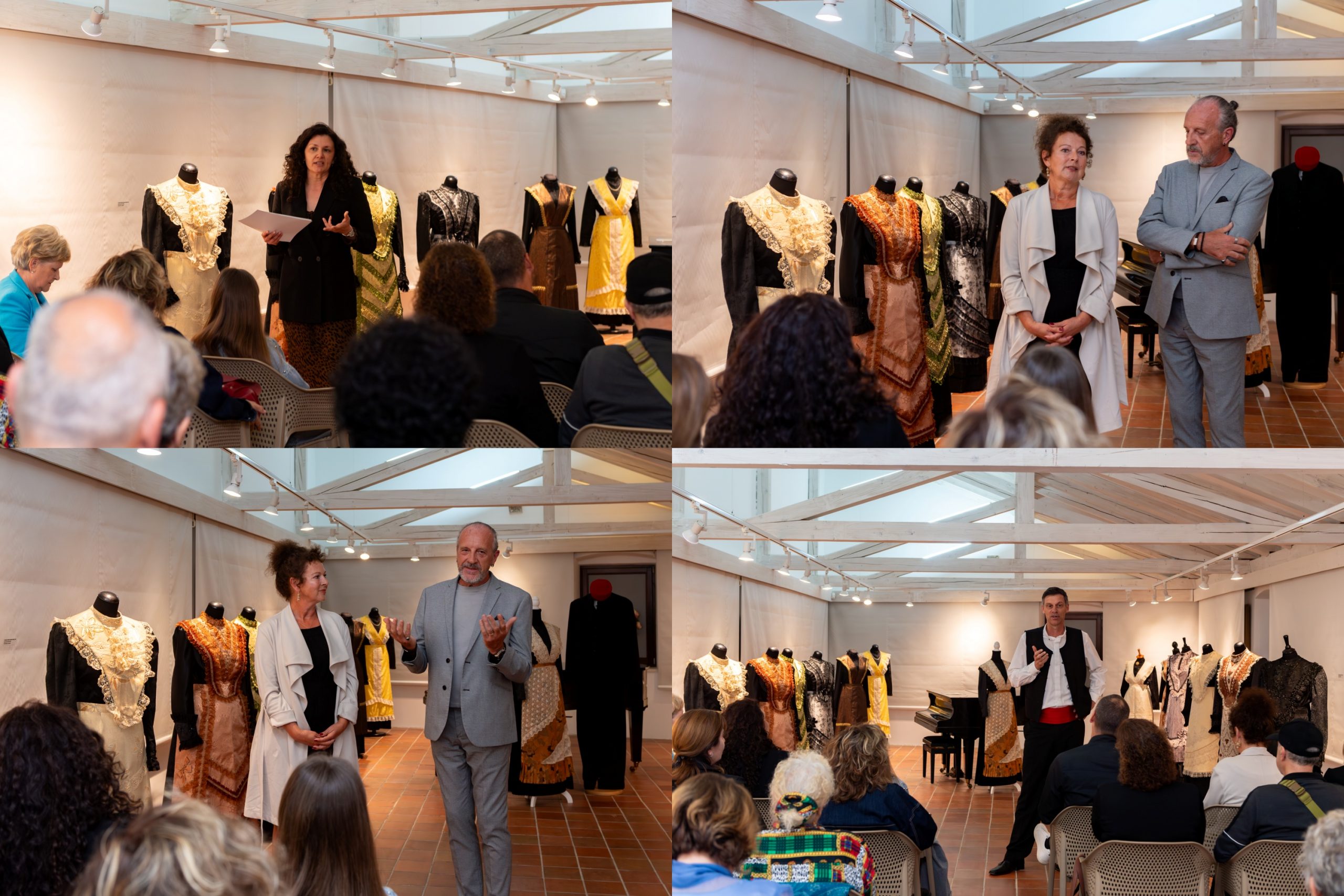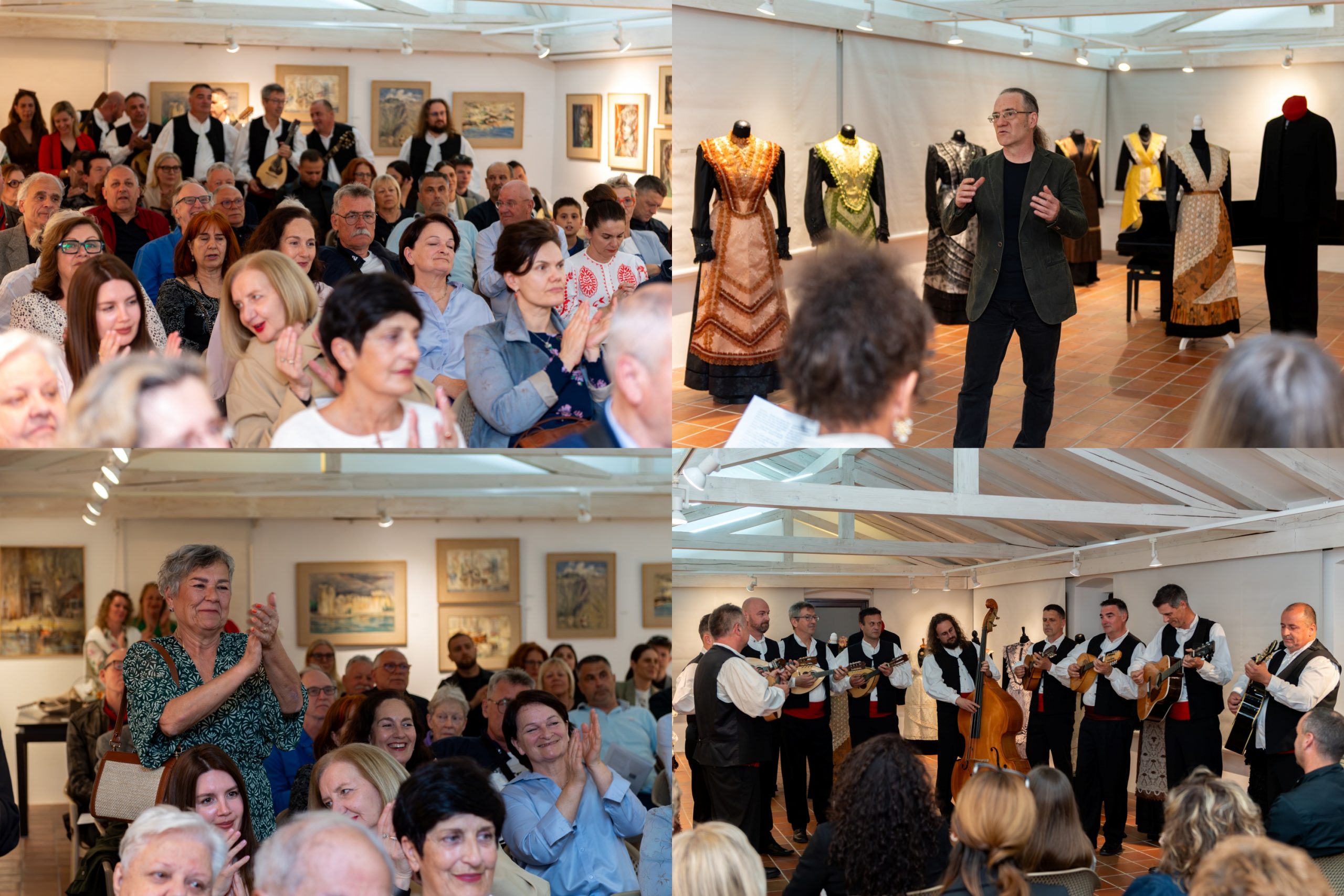 Nakon dodjele prigodnih zahvalnica donatorima i sponzorima, okupljenima su se obratili Jasna Popović, voditeljica Područne konzervatorske službe Trogir, te autori izložbe Anita i Mario Galić. Večer je potom dobila glazbeni ton – o nosaču zvuka „Folklorni plesovi srednje Dalmacije“, objavljenom u izdanju Extra Musica, govorili su Jakov Košćina i Ivan Cinotti, dok je mandolinski orkestar KUD-a „Kvadrilja“ publiku oduševio izvedbom Šotića. Čast da otvori izložbu pripala je Viktoru Novaku, zamjeniku gradonačelnika Grada Trogira. Program je vodila dr. sc. Danka Radić.